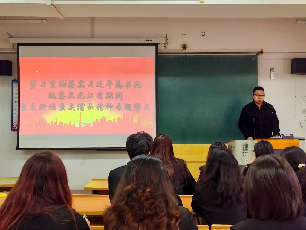 学院团委书记闵诗尧以《学习贯彻落实习近平总书记视察黑龙江省期间的重要讲话重要指示精神》为题,围绕“牢牢把握在国家发展大局中的战略定位”“走出一条高质量发展、可持续振兴的新路子”“在新时代新征程推进东北全面振兴中展现新气象、新作为”三方面带领大家深刻领会习近平总书记重要讲话和重要指示精神的深刻内涵及其实践要求。希望学生党员积极响应国家号召,投身创新创业,以更加昂扬的斗志、更加务实的作风,投身到推动东北全面振兴的伟大事业中,为振兴龙江贡献青春力量。