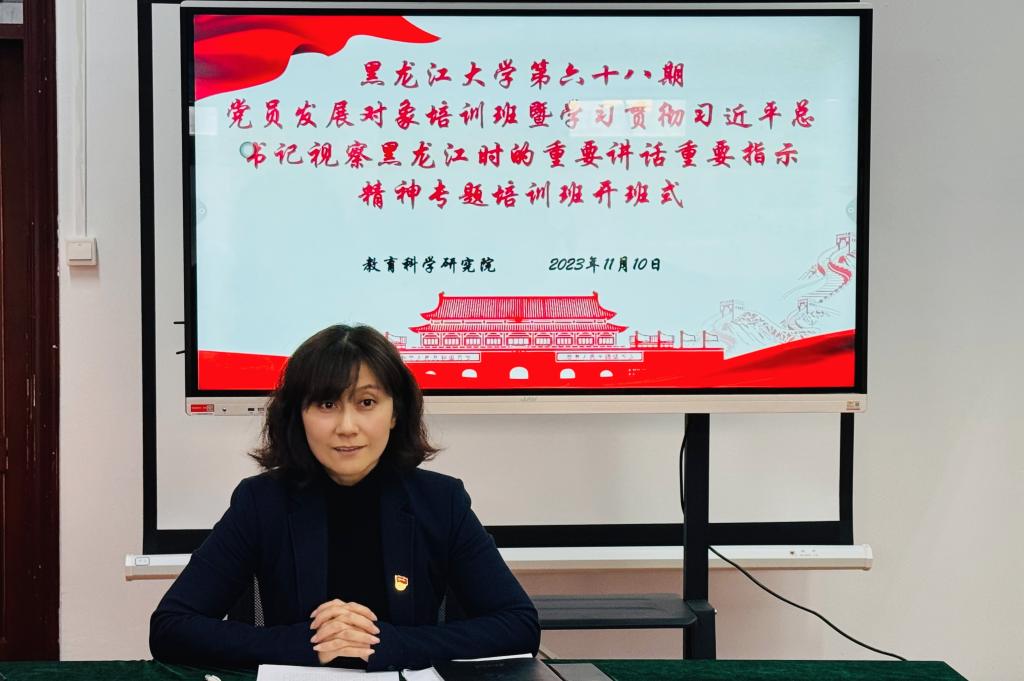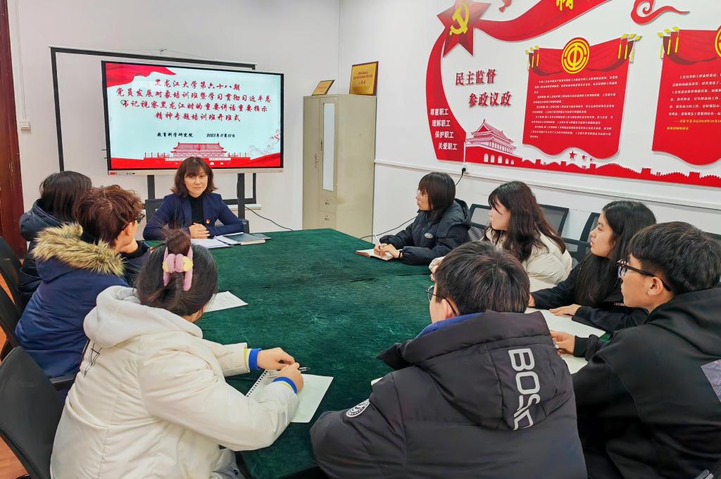 为深入学习贯彻习近平新时代中国特色社会主义思想,加强对党员发展对象的教育与管理,按照《关于举办黑龙江大学第六十八期党员发展对象培训班暨学习贯彻习近平总书记视察黑龙江时的重要讲话重要指示精神专题培训班的通知》要求,教育科学研究院于2023年11月10日15时,在汇文楼959会议室举办黑龙江大学第六十八期党员发展对象培训班开班式。本次开班式由学院党总支书记綦明霞主持,培训班全体成员参加。