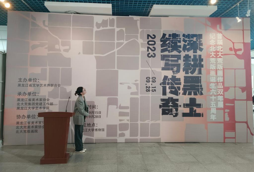 为全面学习贯彻习近平新时代中国特色社会主义思想和党的二十大精神,大力弘扬中华优秀传统文化,2023年9月26日15时30分,在教育科学研究院团委副书记、2023级辅导员宋美琪带领下,2023级新生来到艺术学院一楼展厅参观由黑龙江省文学艺术界联合会主办,黑龙江省美术家协会、北大荒集团党建工作部、黑龙江大学艺术学院承办的“纪念北大荒版画诞生六十五周年·深耕黑土·续写传奇——首届北大荒版画作品双年展”。
