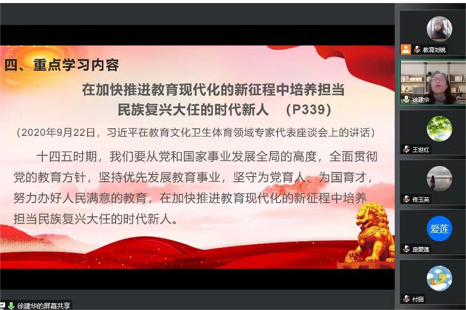 2022年10月14日19时,教育科学研究院党总支理论学习中心组于线上开展专题学习,学习内容主要为《习近平谈治国理政》第四卷和全国教书育人楷模杨士莪先进事迹,本次学习由教育科学研究院教育行政联合党支部书记徐建华领学,理论学习中心组全体成员参加,院长王世红列席,会议由学院党总支书记金鹏主持。