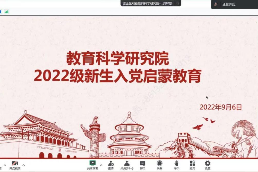 为做好2022级新生思想政治教育,引导2022级新生积极向党组织靠拢,2022年9月6日14时,教育科学研究院开展2022级新生入党启蒙教育。学院党总支书记金鹏、党总支副书记付丽、团委副书记及2022级辅导员王馨莹、2022级全体同学参会,会议由学院组织员刘锐主持。