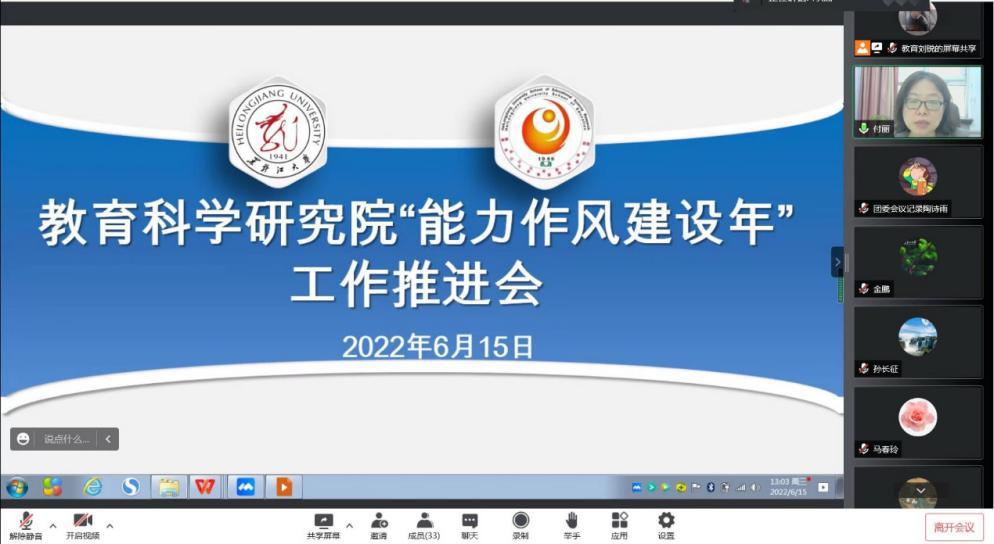 为推进广大教师提升能力、转变作风,结合《黑龙江大学“能力作风建设年”活动实施方案》要求,教育科学研究院于2022年5月12日和6月15日分别召开“能力作风建设年”工作推进会。会议由学院党总支书记金鹏主持,全院教职工参会。