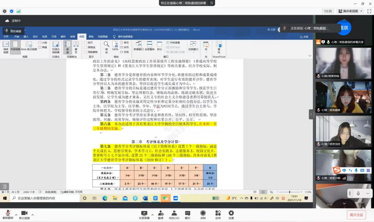 为进一步加强教育科学研究院德育管理工作,更好地落实立德树人根本任务,全面提升我院学生综合素质,根据《黑龙江大学学生管理规定》和《黑龙江大学学生德育学分修读办法(2020修订)》,教育科学研究院于2021年11月15日、17日先后在汇文楼951室开展德育学分审核负责人培训会议、在腾讯会议平台开展德育学分修读办法解读会议。会议分别由2021级辅导员王馨莹老师、班级德育学分审核负责人主持,全体2021级同学参会。