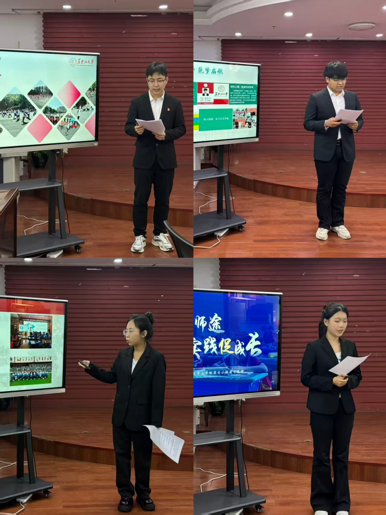 会议伊始,贾宝汝老师对在场来宾表示诚挚欢迎,并对我院学生寄予深切期望。各实习小组代表依次上台,通过精彩的PPT展示与生动讲述,分享了在实习学校的教学实践、班级管理、师生互动等方面的经历与感悟。实习代表们谈到,从初登讲台的紧张到逐渐掌握课堂节奏,他们通过参与班级管理、课程设计,深刻体会到理论知识与实践结合的重要性,不仅提升了教学技能,更学会了如何与实习指导老师进行沟通,准确把握学生需求。其他实习学生也纷纷表示,实习期间,他们在教学实践、团队协作、问题解决等方面得到了全方位锻炼,对教育行业有了更直观且深刻的认识,明确了未来的职业发展方向。