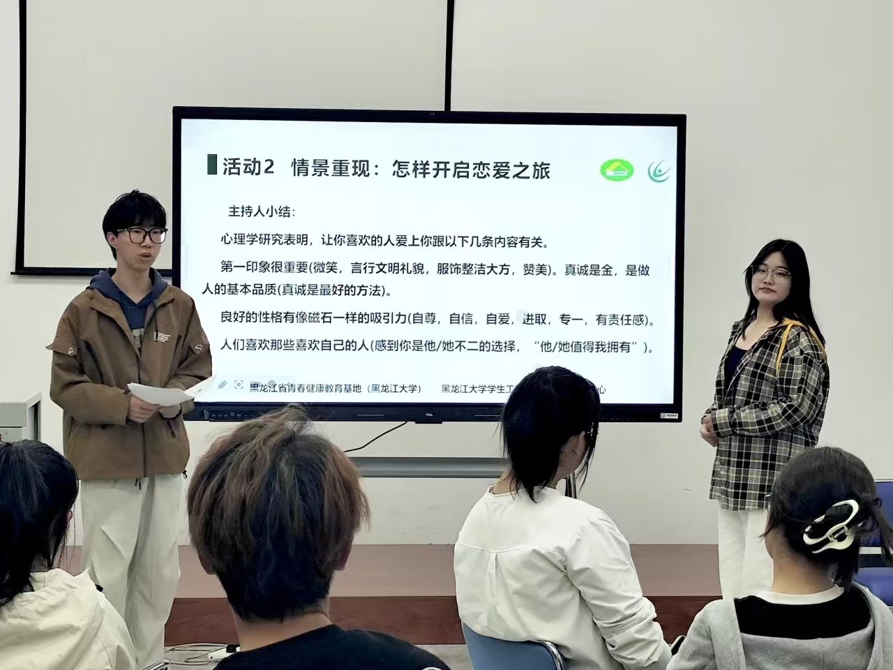 于9月20日18时在大学生活动中心430室举办了“乐享青春,和谐人际”青春健康团体活动,本次活动由青春健康同伴教育主持人吕昊、刘芋含主持。
