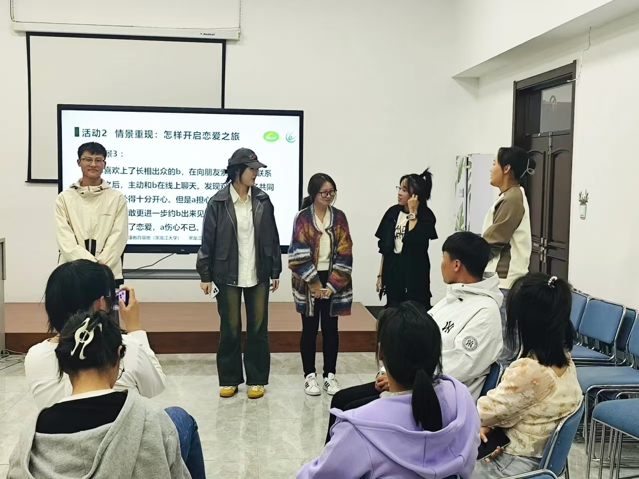 环节二“情景重现:怎样开启恋爱之旅”,主持人对活动进行简单介绍,“恋爱之旅”在同学们的精彩演绎下展开,他们全身心投入到角色中,感受恋爱中的喜怒哀乐,他们的表情随着剧情发展,时而紧张、时而兴奋。在这个过程中,同学们更深地理解了恋爱关系。