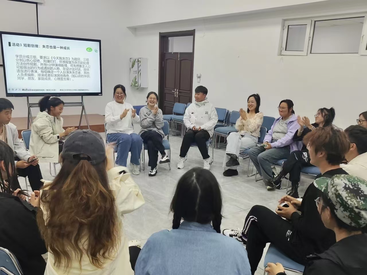 环节三“短剧创作:失恋也是一种成长”,各小组同学充分发挥创造力,以独特的视角创作出了别具一格的精彩剧情。主持人细心地为同学们指导剧情,同学们所呈现的欣喜、悲伤、兴奋、失望等情绪,很好地展现了恋爱中青年男女的相处模式。
