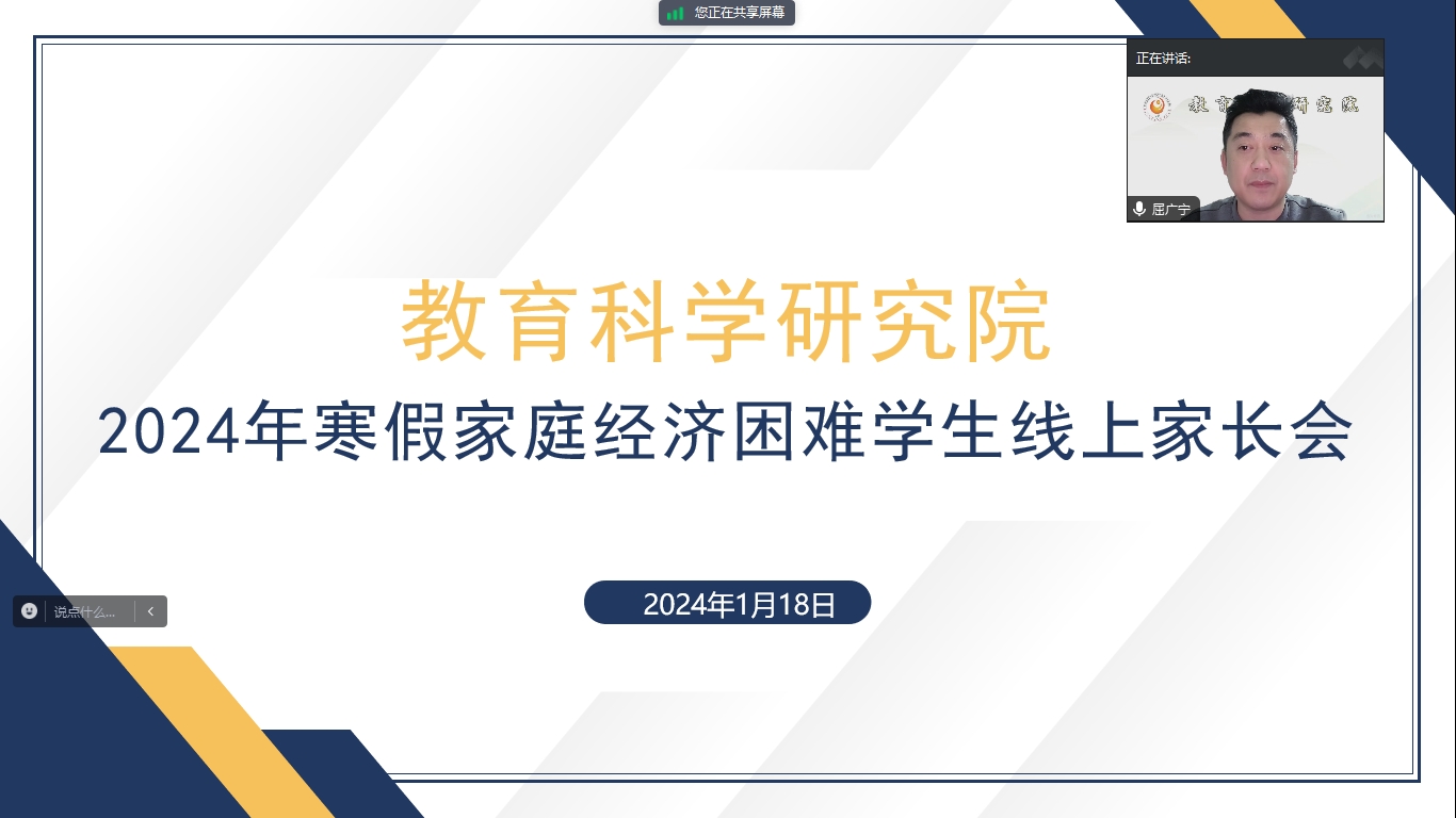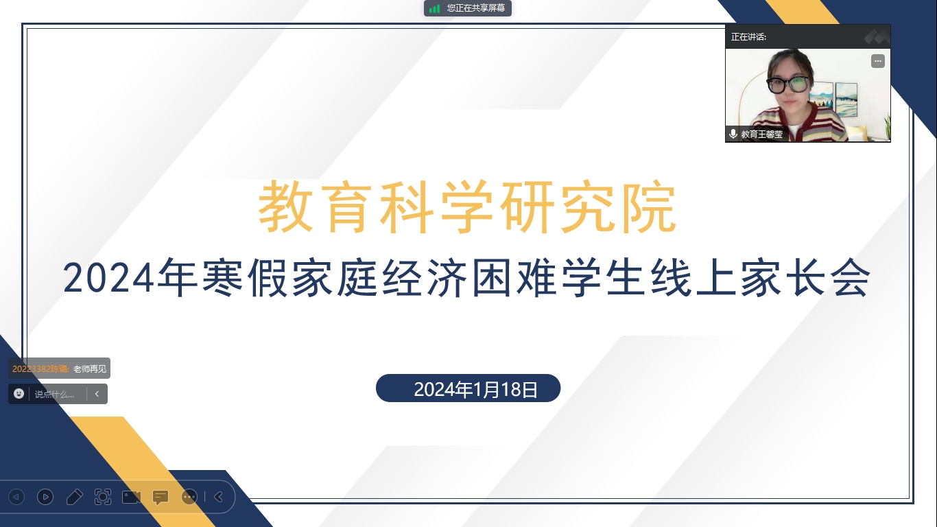 教育科学研究院于2024年1月18日18时30分在腾讯会议平台开展家庭经济困难学生家长会,2021级辅导员王馨莹主持会议,院党总支副书记屈广宁、各年级辅导员、家庭经济困难学生及其家长参会。会议伊始,2022级辅导员闵诗尧对家庭经济困难学生及家长表达了亲切的关怀和问候,向学生及家长宣传了国家及学校的资助政策,介绍了包括奖学金和助学金在内的四虎影院