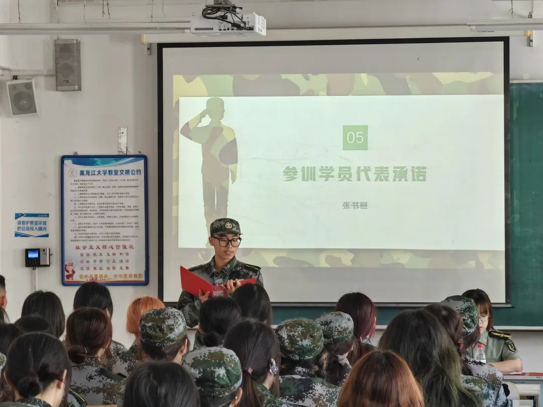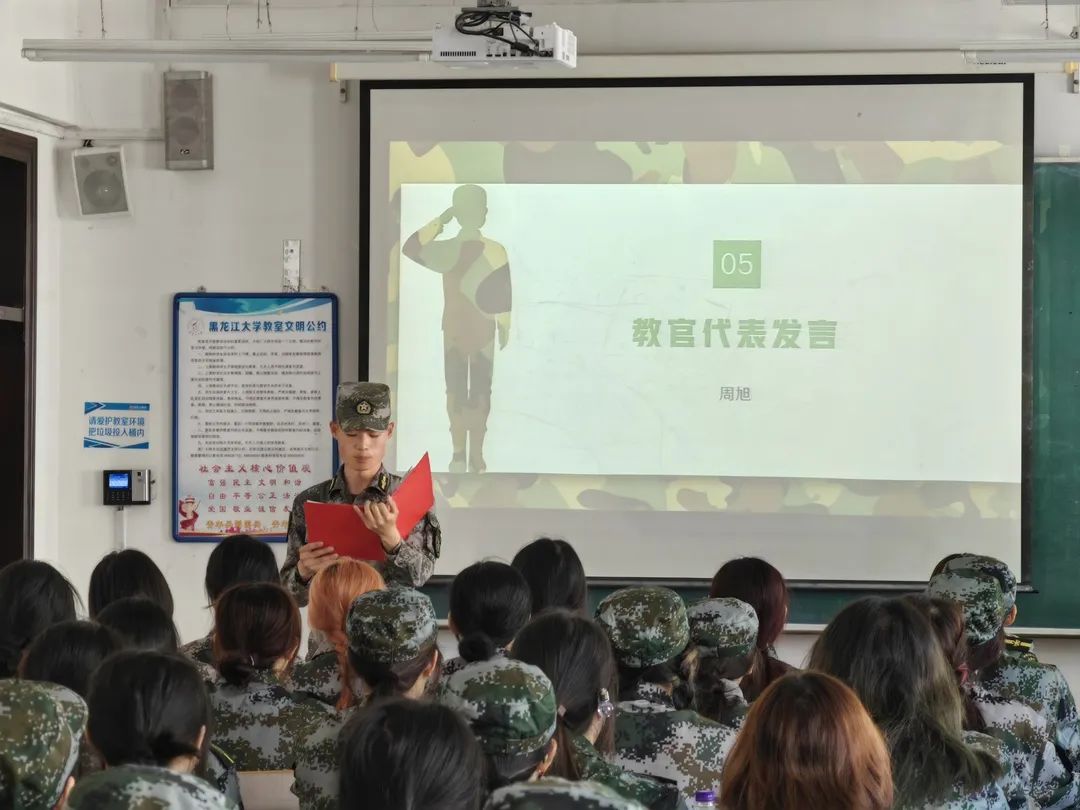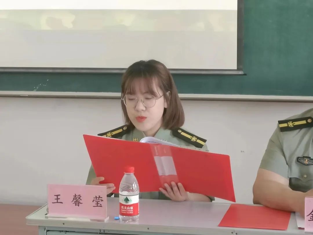 王馨莹宣读《黑龙江大学教育科学研究院2022级学生军训制度》,呼吁同学们要以军人为榜样,在接下来五天的军训中,不光要学习军事队列动作,还要学习国防知识,感受军人的可贵品质,严于律己,在磨炼中成长,在逆境中坚强!