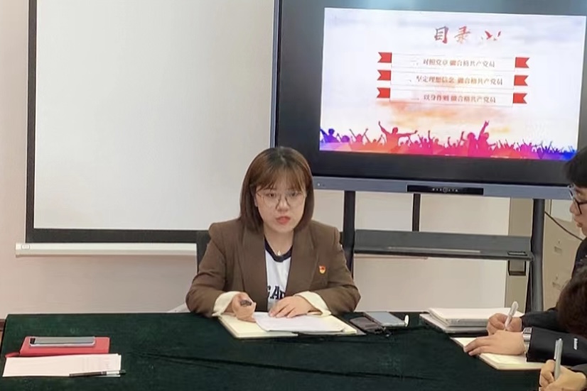 学院团委副书记,2021、2022级辅导员王馨莹以“从实际出发,争做合格大学生党员”为主题,并结合中国共产党章程,向大家讲述了学习党章对党员自身发展的重要意义。同时指出,若成为一名合格的大学生党员,学习党的章程始终是第一位的要求。王老师鼓励大家要在学院内带头营造善于学习、勇于实践的浓厚氛围,充分发挥好自身“领头羊”的作用,主动学习党的创新理论,增强学习本领!