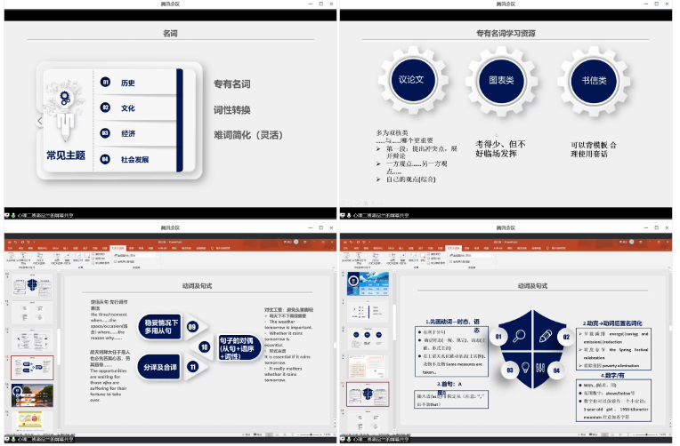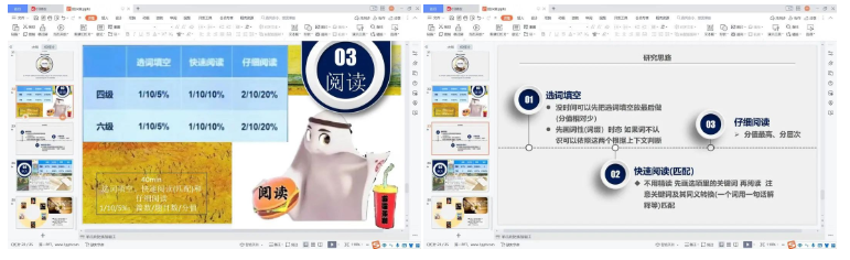 本次会议主要围绕英语四六级考试中的翻译、写作、阅读和听力四个方面展开。首先,窦品兰同学就英语四六级考试中翻译与作文的类型、题目以及写作方法做了经验分享并将所占的分值与所用时间以及相应的字数要求展示给大家,她提到四六级翻译的常见主题有历史、文化、经济和社会发展四个方面并且可大致分为议论文、图表类、书信类三大翻译类型,向同学们介绍了部分专有名词的学习资源和常用的动词与句式,并建议同学们从专有名词的积累、词性简化以及灵活地进行难词简化三个方向入手,学会灵活使用同义词替换。