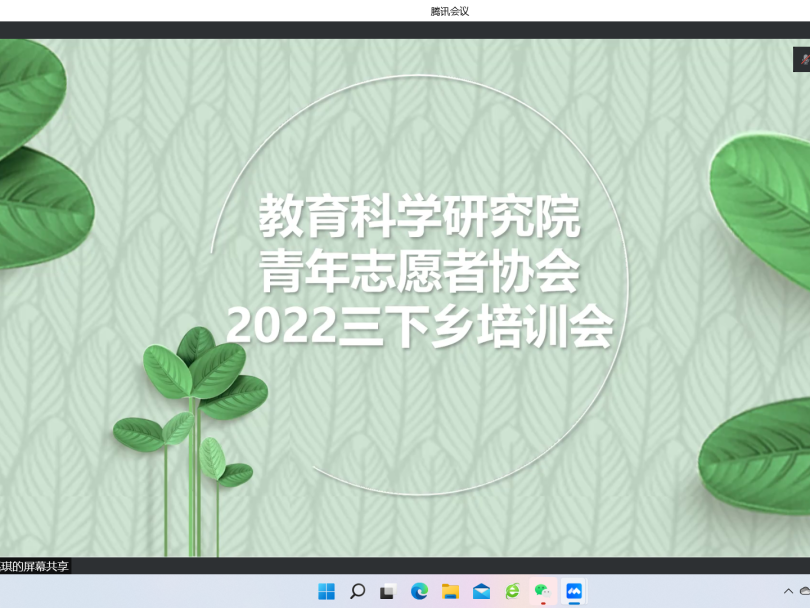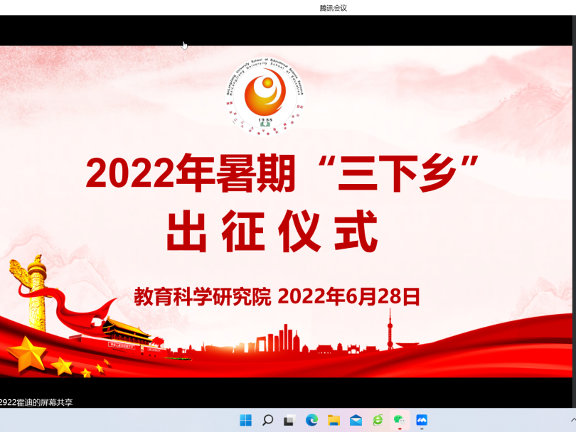 为进一步引导青年学生在社会课堂中“受教育、长才干、作贡献”,教育科学研究院于2022年6月28日依托腾讯会议平台举行2022年暑期“三下乡”社会实践活动出征仪式。学院党总支书记金鹏、学院党总支副书记付丽、2020级辅导员梁曼老师、2021级辅导员王馨莹老师及“三下乡”服务队队员参加本次出征仪式。