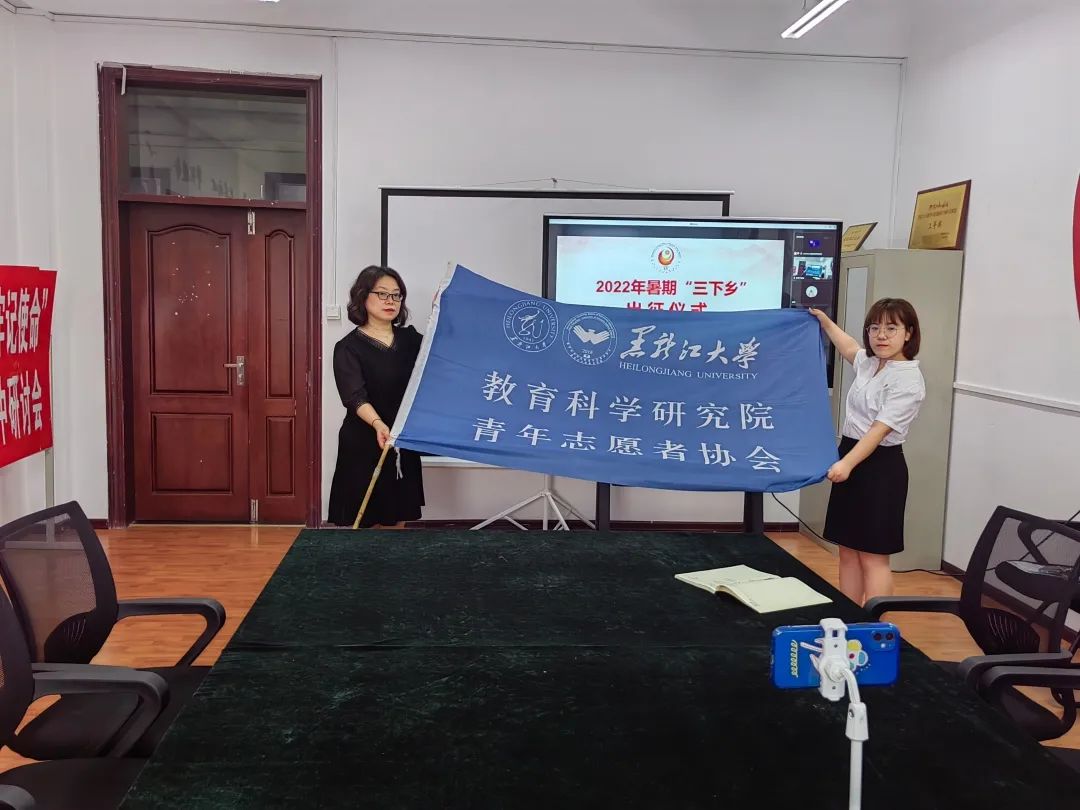 最后党总支书记金鹏和党总支副书记付丽为本次“三下乡”社会实践团队进行授旗,出征仪式到此结束。