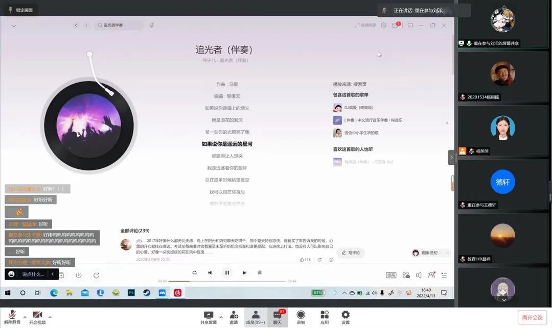 活动现场异常火爆,选手们满怀激情,用他们的奇妙歌声感染着观众的心灵,评论区观众热情高涨,纷纷为线上选手加油。姜倩同学的《我要你》温柔舒缓、徐烨成同学的《如愿》悠扬婉转、窦品兰同学的《开心往前飞》热情洋溢、王超同学的《小幸运》低沉动听,贺羽佳同学的《Holy》风格鲜明、王骏铮同学的《总有一天你会出现在我身边》余音缭绕、申晨祥同学和汪先洋同学合唱的《好汉歌》清脆淳朴、气势磅礴,将活动的气氛推向高潮,节目中的歌曲众多,风格也各不相同,有温柔抒情的情歌、有活泼欢脱的儿歌、还有别饶风致的说唱、多才多艺的选手们风格百变,惊艳四座......