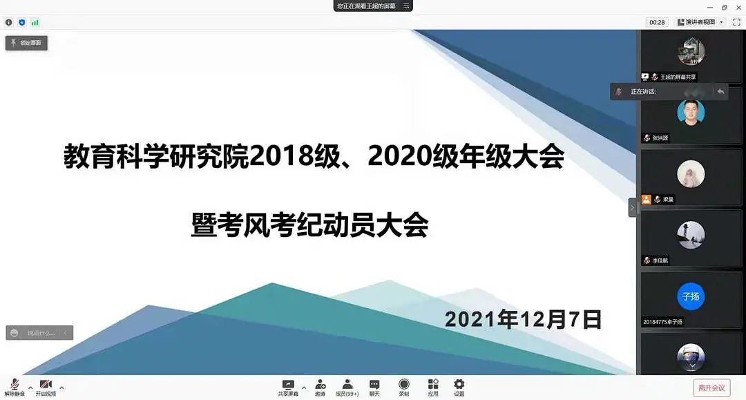 为推动近期考试的顺利进行,结合疫情防控工作的有关要求,2021年12月7日教育科学研究院于腾讯会议平台举行考风考纪教育暨安全教育大会。本次会议由2018级,2019级辅导员闵诗尧,2020级辅导员梁曼,2021级辅导员王馨莹分别主持,全体同学参会。
