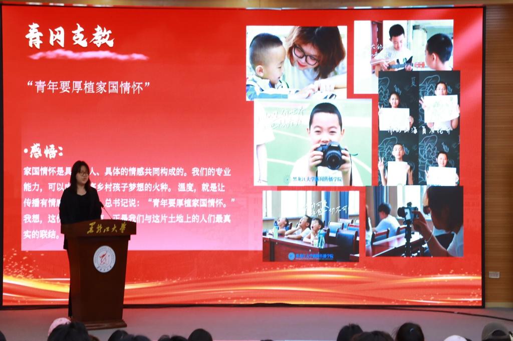 赵恪正同学以《在志愿中奉献,于热爱中绽放》为题进行宣讲。他以“初入大兴安岭塔河县的支教心路”为引,通过分享与孩子们从陌生到建立深厚羁绊的真实点滴,生动展现“七彩假期”中非遗剪纸课堂的文化传承、VR科技体验的视野开拓,以及家乡主题绘画里激发的乡土情怀。他结合个人成长感悟,号召青年将个人理想与国家命运紧密相连,用行动书写青年的壮丽篇章。