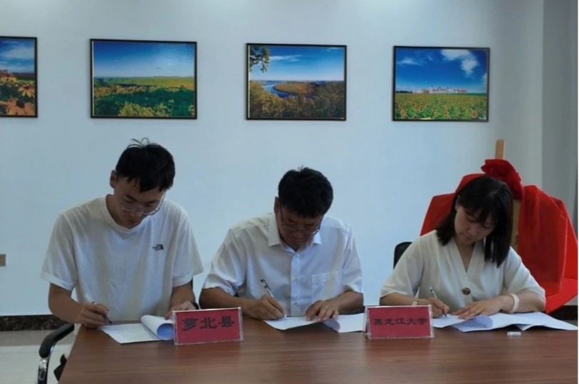 在与会领导的共同见证下,黑龙江大学政府管理学院党委书记王佳与萝北县委副书记任佳伟共同为社会实践基地揭牌。