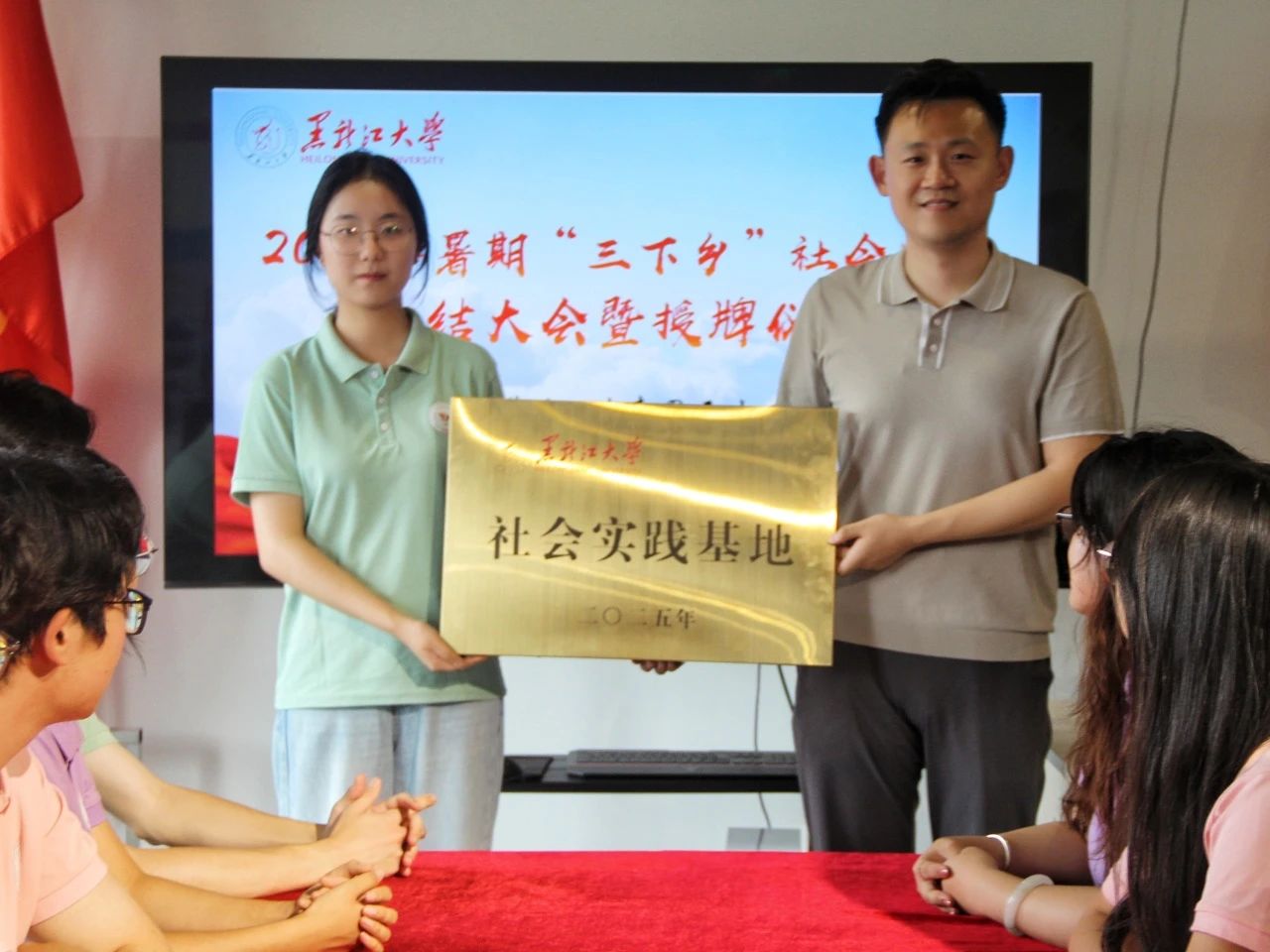在与会人员见证下,“萤火育兴”服务队授予共青团五大连池市委员会“黑龙江大学社会实践基地”称号。