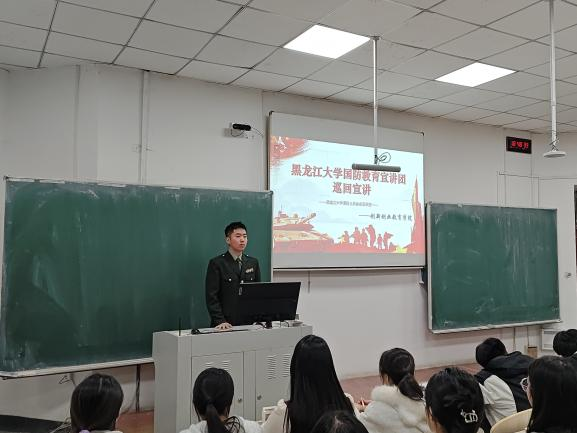 于4月9日开展征兵宣讲。本次会议邀请黑龙江大学国防教育宣讲团成员主讲,学院团委副书记梁曼、王冠琪及2025级全体同学参会。