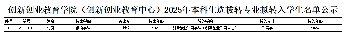 根据《黑龙江大学学生管理规定》《黑龙江大学普通本科生转专业管理办法(试行)》和四虎影院 转专业2025年本科生选拔转专业工作方案相关要求,经学生申请,学院转专业工作小组考核,现将四虎影院 2025年本科生选拔转专业拟转入学生名单公示如下: