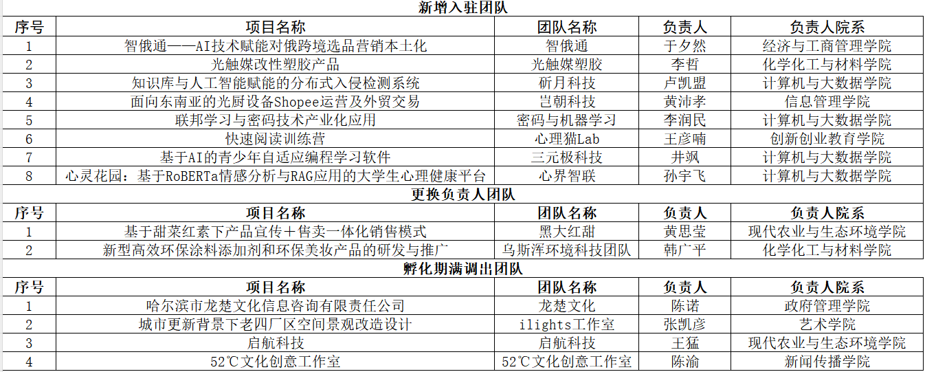 经黑龙江大学学生科技文化创业园专家组评审,2025年度秋季学期黑龙江大学学生科技文化创业园学生创业团队调整公示如下: